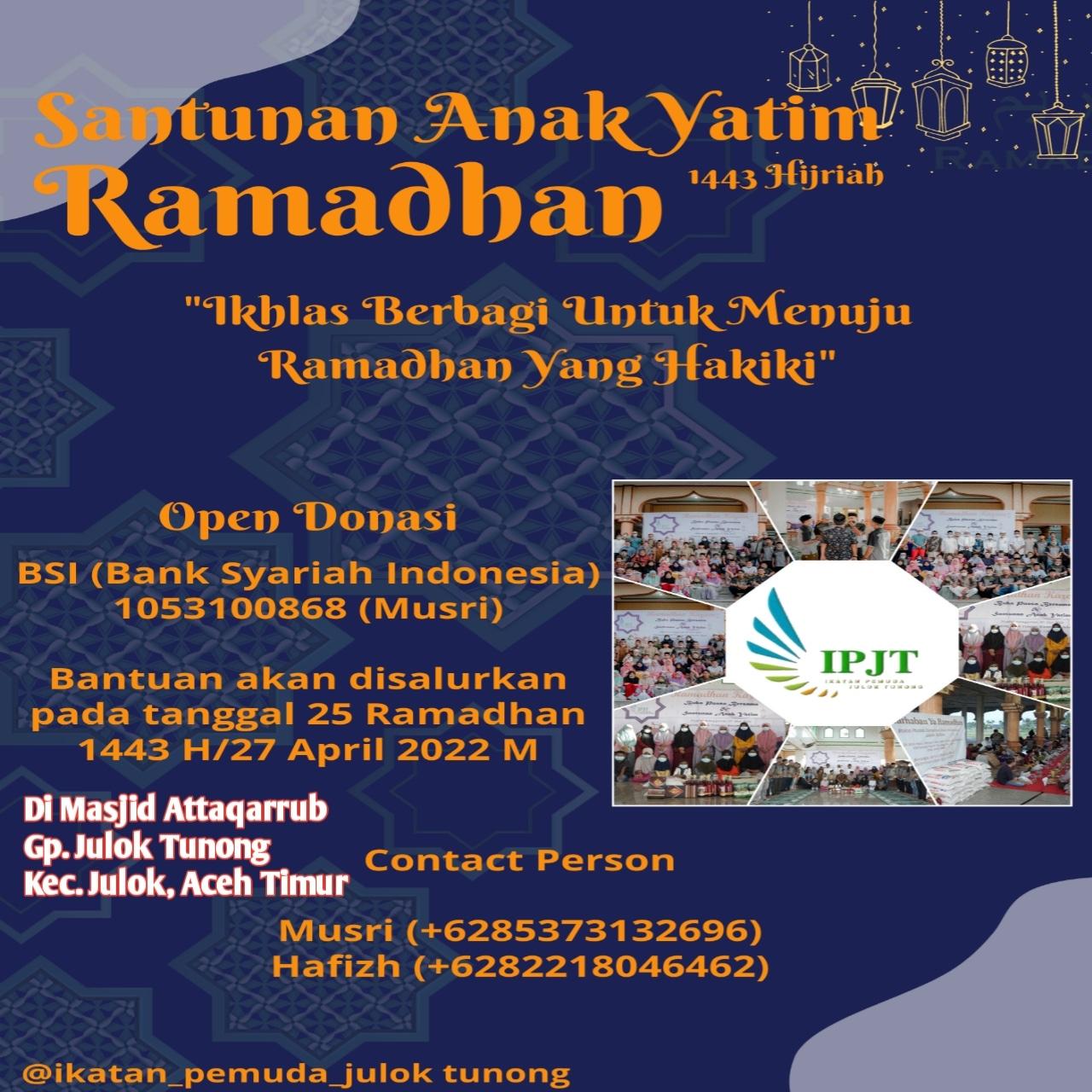 ACEH TIMUR – Seperti Ramadhan tahun tahun sebelumnya, Ikatan Pemuda Julok Tunong (IPJT), Remaja Masjid Attaqarrub (Remasta) beserta Pemerintah Gampong Julok Tunong Kecamatan Julok Kabupaten Aceh Timur akan laksanakan Buka puasa Bersama dan Santunan Anak Yatim, Jum’at 8/4/2022.