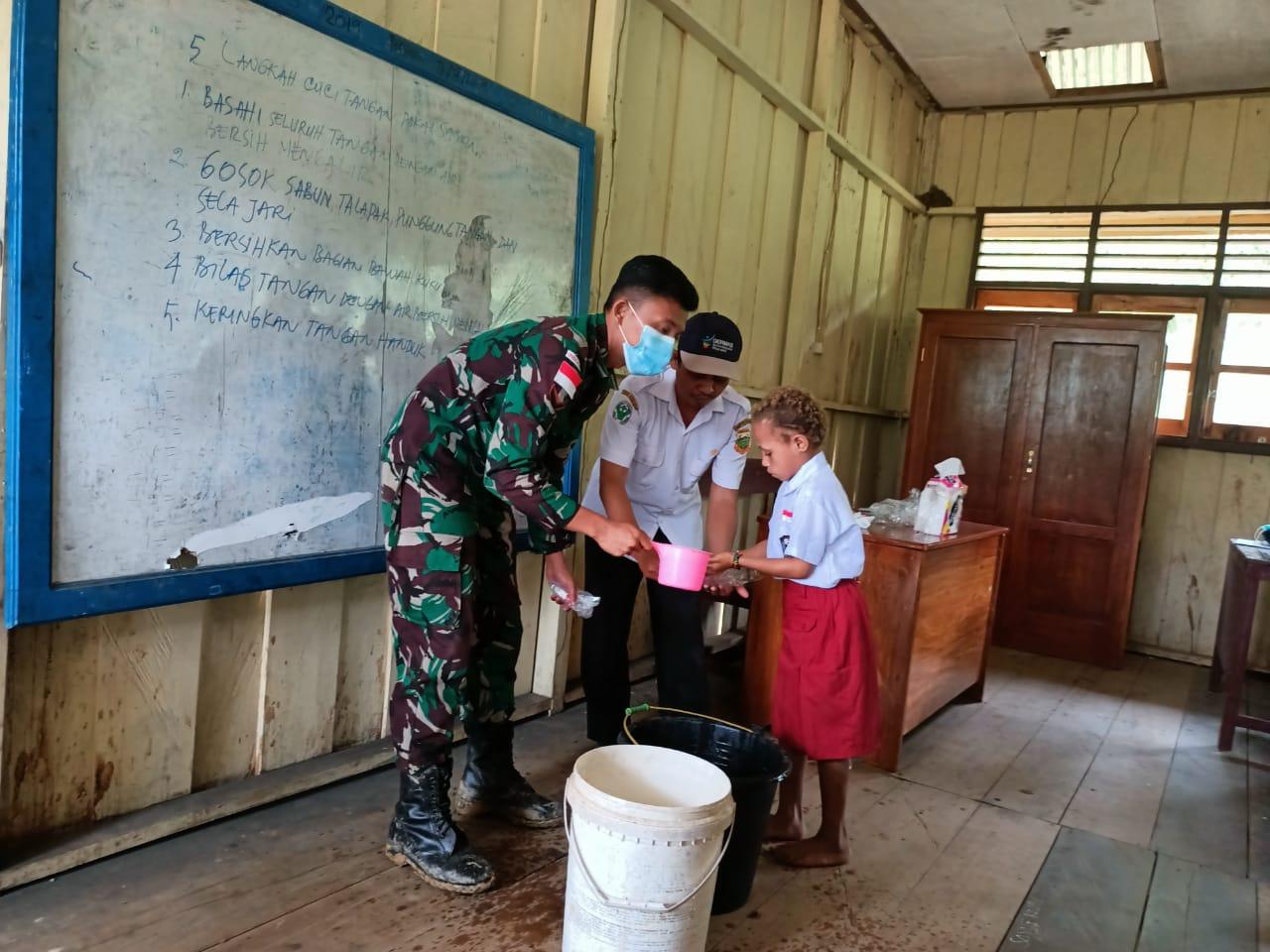 KEEROM – Masih berlangsungnya pandemi wabah virus Corona (Covid-19), personel Satgas Pamtas RI-PNG Yonif 126/KC Pos Yuruf, memberikan salah satu edukasi menjaga kebersihan yakni cara mencuci tangan secara baik dan benar kepada anak-anak SD Negeri Favenumbu di Kampung Favenumbu, Distrik Yaffi, Kabupaten Keerom.