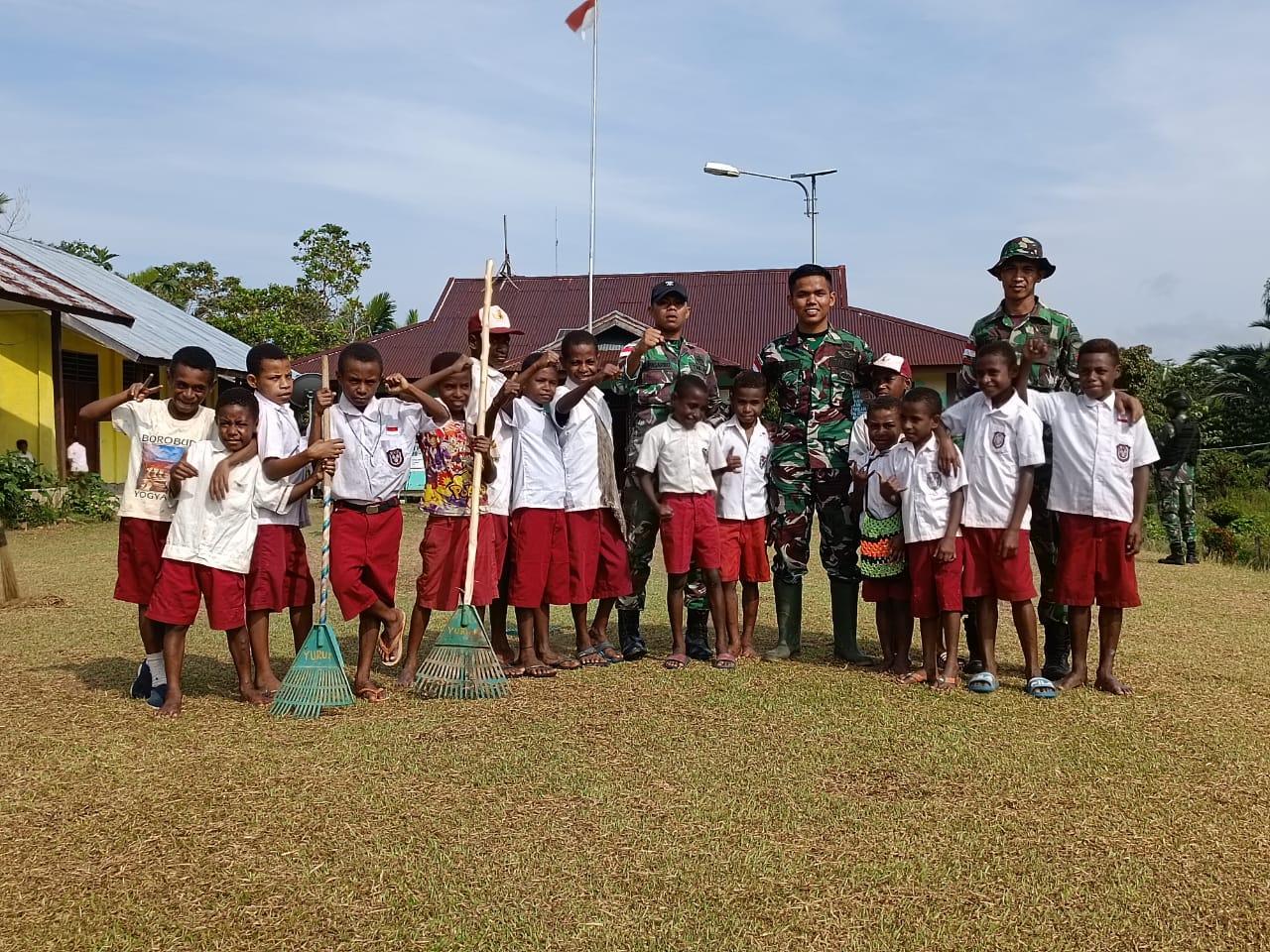 KEEROM – Dalam rangka mengajarkan kepedulian terhadap kebersihan lingkungan sejak usia dini, prajurit Satgas Pamtas Yonif 126/KC Pos Yuruf mengajak para murid untuk membersihkan sekolah SD YPPK Yuruf-Amgroto, Distrik Yaffi, Kabupaten Keerom.
