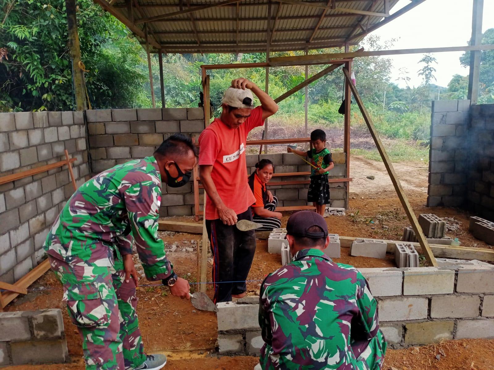Personel satgas Pamtas selalu siap membantu kesulitan-kesulitan masyarakat yang ada di sekitar perbatasan, seperti yang dilakukan anggota pos Sei Beruang, melalui kegiatan pembinaan teritorial ini anggota Satgas membantu pembuatan salah satu rumah warga mulai dari penggalian pondasi hingga pemasangan batu.