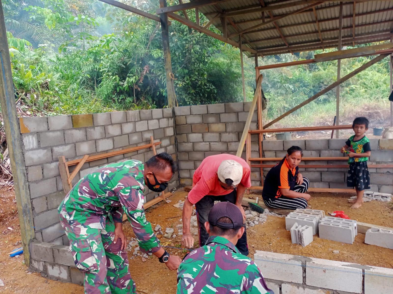 Anggota Satgas Yonif 144/JY Membantu Pembuatan Rumah Warga di Perbatasan
