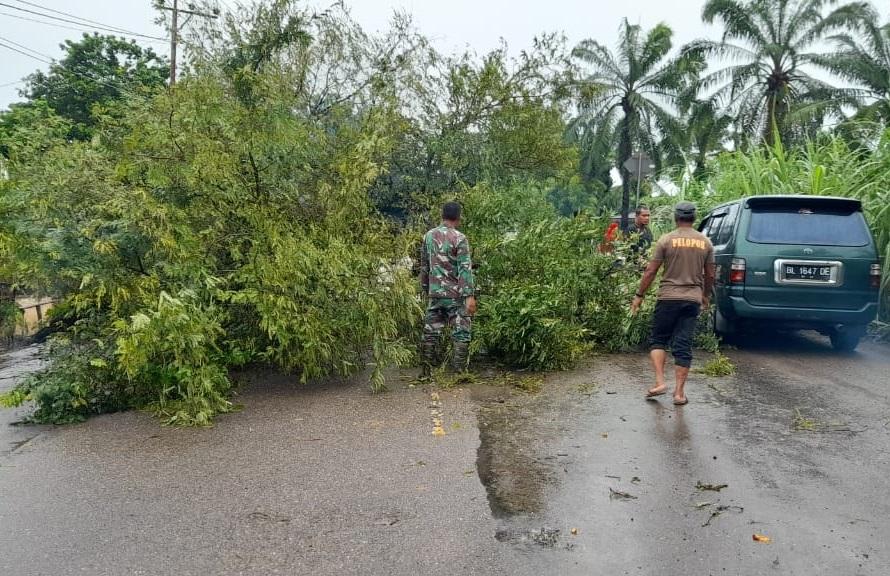 ACEH TIMUR โ Koptu Nunung Babinsa Koramil 03/Rantau Seulamat Kodim 0104/Atim bersama warga melakukan gotong royong evakuasi pohon yang tumbang akibat hujan dan angin kencang, dijalan Lintas Medan Banda Aceh tepatnya di Desa Bayeun, Kecamatan Rantau Seulamat, Kabupaten Aceh Timur, Sabtu (08/10/2022) pagi.