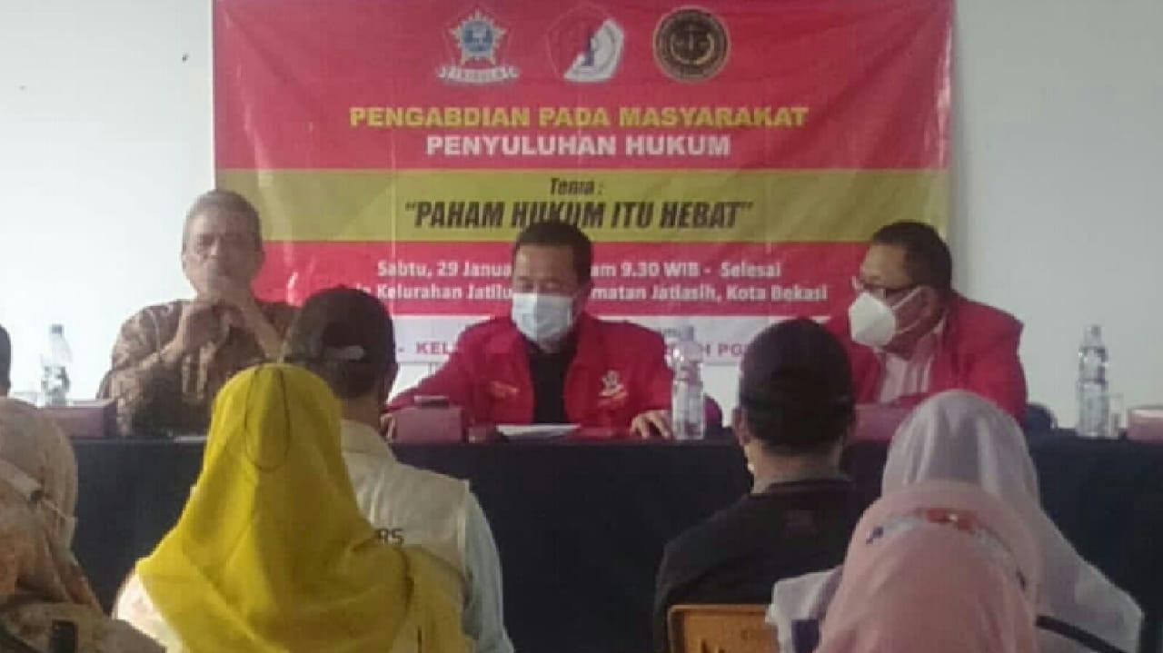 KOTA BEKASI — Lembaga Konsultasi dan Bantuan Hukum (LKBH) TRISULA Kota Bekasi bersama STIH Profesor Gayus Lumbuun dan Badan Advokasi Konsultasi Bantuan Hukum Masyarakat Adat Kerajaan Nusantara (BAKUM MAKN) Kembali melakukan kegiatan pengabdian pada masyarakat yaitu dengan memberikan penyuluhan hukum bagi masyarakat. Jatiluhur Jatiasih Kota Bekasi Jawa Barat. Sabtu (29/1) Siang