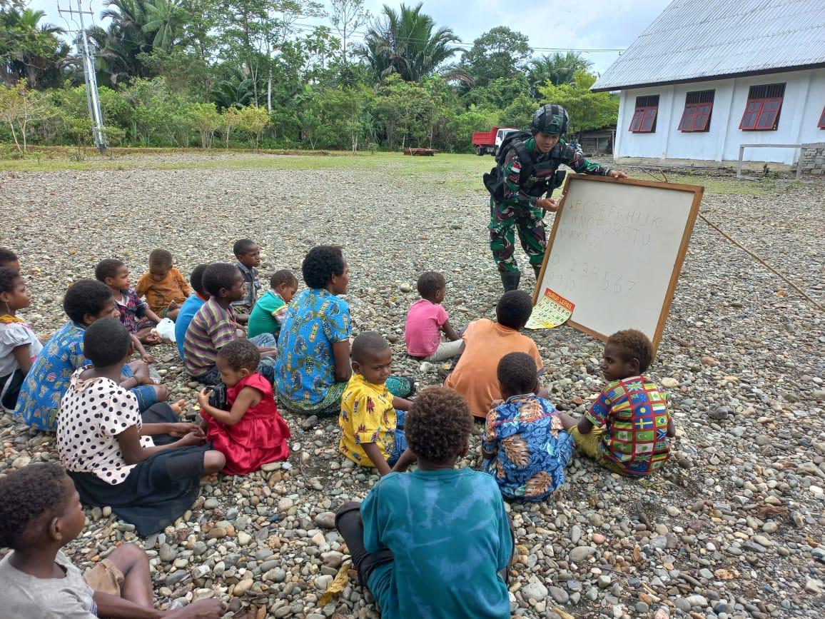 YAHUKIMO – Guna membangun generasi muda Papua yang tangguh dan berpendidikan, banyak cara yang bisa dilakukan. Satgas Pamtas Yonif Raiderr 142/KJ memberikan pengajaran langsung kepada anak-anak berupa pengenalan huruf Alfabet dan angka-angka di Kampung Kekey, Distrik Dekay, Kab. Yahukimo, Papua, Senin (18/7/2022).