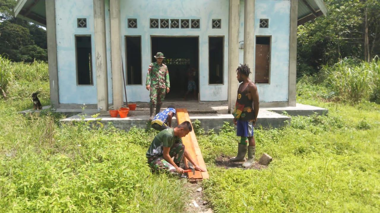 KEEROM – Membantu wujudkan tempat ibadah yang nyaman, personel Satgas Pamtas Yonif 126/KC Pos Bompay bersama masyarakat mengadakan gotong royong merenovasi lantai Gereja Santo Yohanes Pemandi Kampung Bompay, Distrik Waris, Kab. Keerom.