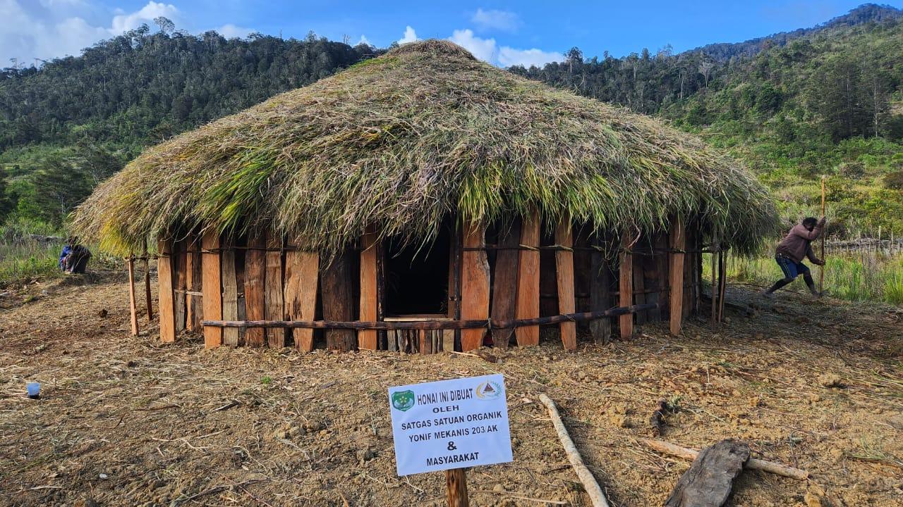 Bersama Masyarakat Satgas Yonif Mekanis 203/AK Bahu-Membahu Membuat Honai