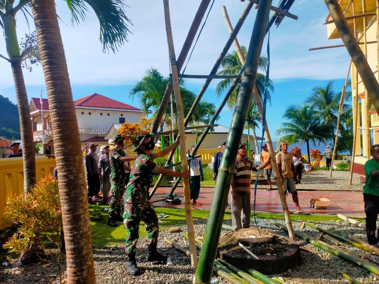 MALUKU TENGAH – Anggota Pos Ramil Wakasihu Satgas Kodim Maluku Batalyon Arhanud 11/WBY bersama dengan Babinsa dan masyarakat Negeri Wakasihu, melaksanakan karya bakti membangun masjid di Negeri Wakasihu, Kecamatan Leihitu Barat, Kabupaten Maluku Tengah, Kamis (3/3/2022).