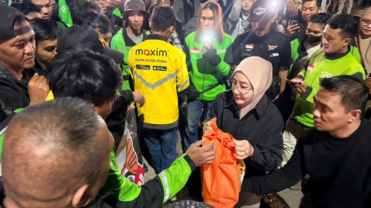 “Saya memberikan sedikit sembako, tidak banyak. Ini hanya bentuk perhatian saya saja kepada mereka, para pejuang rupiah. Tadi juga ada empat perempuan, ibu-ibu yang ikut menarik ojol,” ungkapnya.