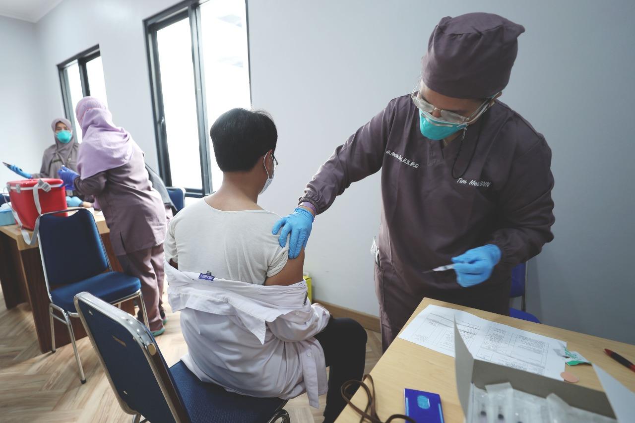Peserta kemudian melakukan registrasi dan diverifikasi oleh petugas untuk selanjutnya dilakukan vaksinasi. Setelah mendapatkan suntikan vaksin, peserta menunggu selama 10 menit untuk dilakukan observasi.