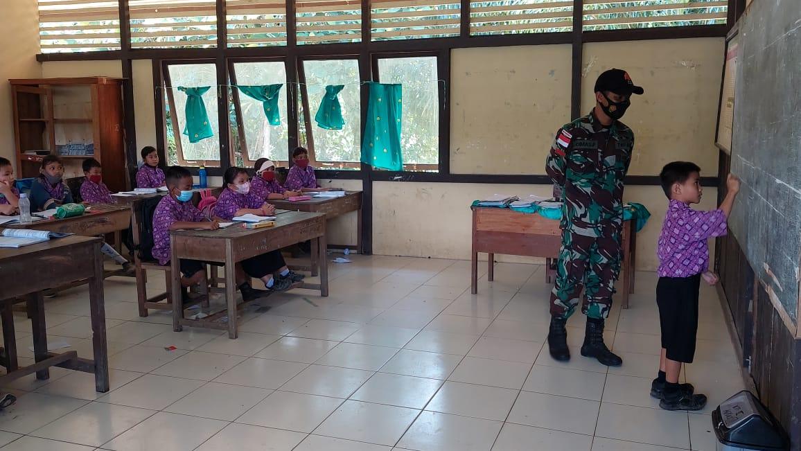 Selain melaksanakan tugas pokok menjaga perbatasan RI-Malaysia anggota Satgas Kami membantu pihak sekolah dalam mencerdaskan anak-anak bangsa sebagai tenaga pendidik di SDN 01 dengan mengajarkan materi Bahasa Indonesia dan wawasan kebangsaan.