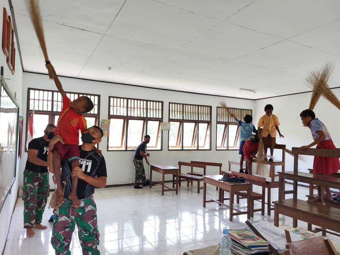 KEEROM  – Pentingnya kebersihan lingkungan sekolah, Satgas Pamtas RI-PNG Yonif 711Rks Brigif 22/OM Pos Yetti melaksanakan karya bakti dengan bergotong royong membersihkan lingkungan sekolah SD di Kampung Yetti, Distrik Arso Timur, Kabupaten Keerom, Papua, Senin (14/08/2022).