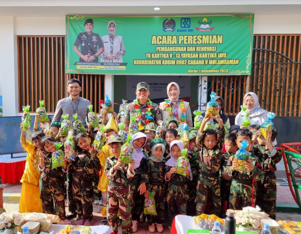 PENDIM 0902/BRU – Komandan Kodim 0902/Berau, Letkol Inf Dony Fatra, S.E., didampingi Ketua Yayasan Kartika Jaya Koordinator Kodim 0902 Cabang V Mulawarman, Ny. Chintya Dewi, meresmikan Renovasi Gedung TK Kartika V-13 Berau, Jl. Pulau Sambit, Kel. Tanjung Redeb, Kec. Tanjung Redeb, Kab. Berau, Jum’at (1/9/2023). Renovasi mandiri ini dilakukan sebagai upaya Kodim 0902/Berau untuk meningkatkan kapasitas dan kualitas belajar mengajar.
