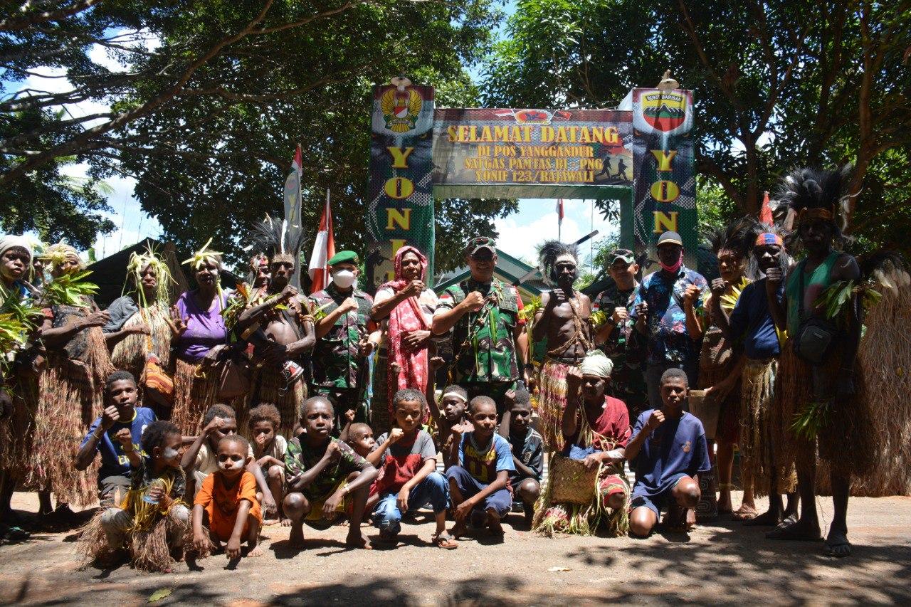 Kedatangan Danrem 174 Merauke di Pos Satgas Pamtas Yonif 123/Rajawali disambutΒ dengan tarian adat masyarakat setempat dengan penuh suka cita didampingi Dansatgas Pamtas RI-PNG Yonif 123/Rajawali Letkol Inf Gorklas Piktahan Silaban dan Danramil Sota Mayor Inf Daniel Ngilawane.