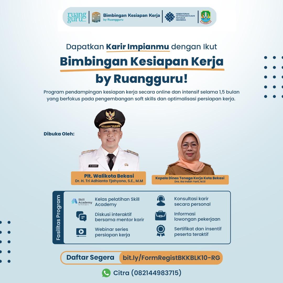 KOTA BEKASI – Bagi masyarakat Kota Bekasi yang masih belum memiliki pekerjaan ataupun masih mencari cari usai lulus dari sekolah ataupun universitasnya. Pencari Tenaga Kerja (Pencaker) untuk mempersiapkan diri melamar kerja pada saat ini Pemerintah melalui Dinas Tenaga Kerja Kota Bekasi lakukan kolaborasi dengan Ruangguru dalam kesiapan kerja, Minggu (30/4/23).
