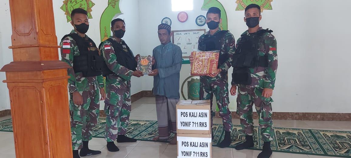 Danpos Kaliasin Satgas Pamtas Yonif 711/Rks Letda Inf Fredy Atang, mengatakan, pemberian bantuan perlengkapan ibadah berupa Al-Quran, Sajadah dan Mukena yang diterima langsung oleh tokoh agama di Masjid Al-Ikhlas perbatasan Bapak Ustadz Arsyad.