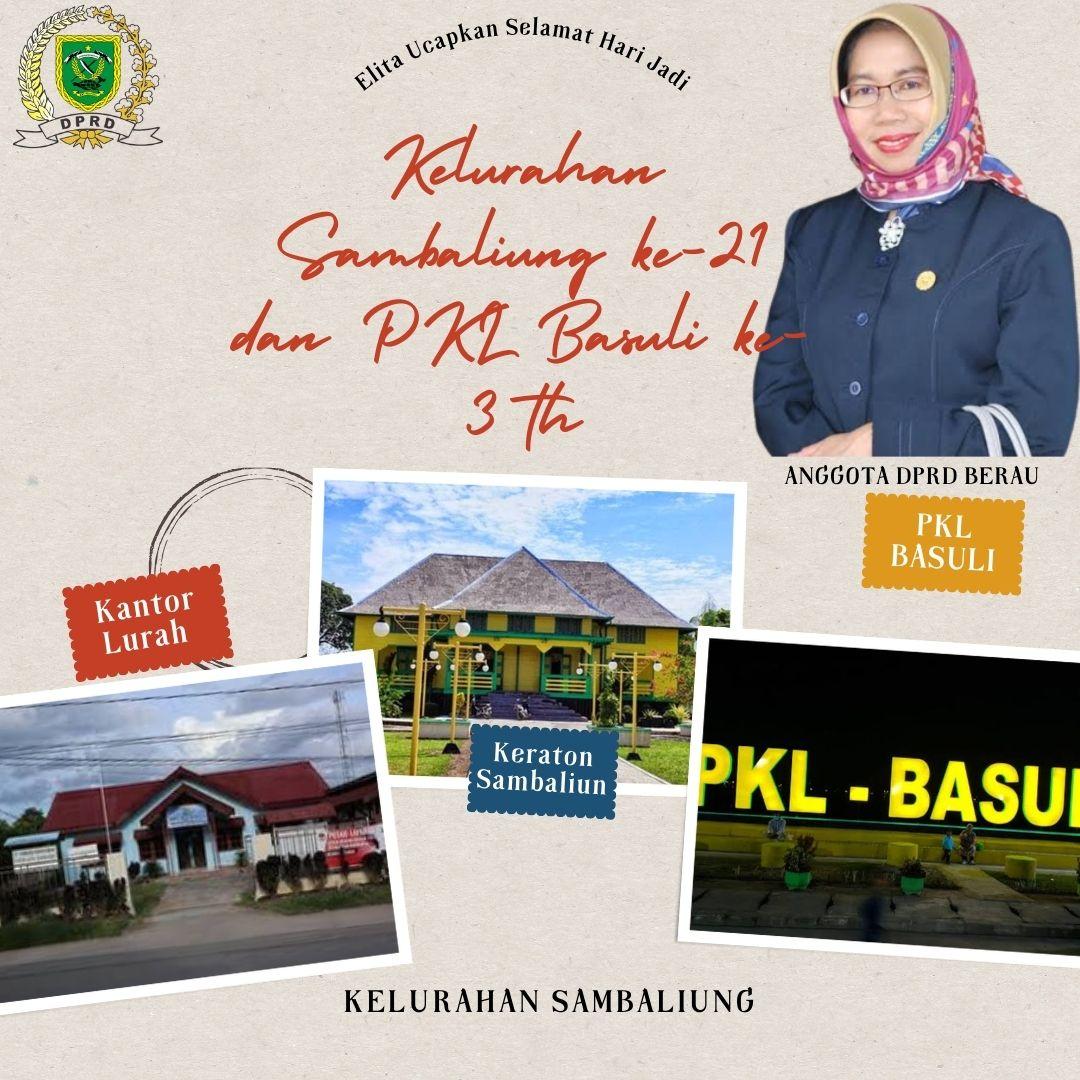 TANJUNG REDEB, Berau Global Satu – Anggota Komisi II DPRD Berau, Elita Herlina mengucapkan selamat Hari Jadi Kelurahan Sambaliung ke-21 dan PKL Basuli ke-3 November 2023.