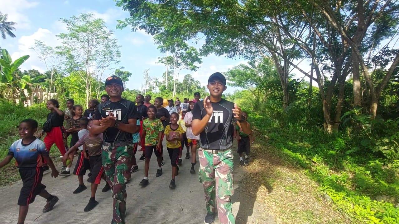 PAPUA – Untuk memeriahkan HUT Kemerdekaan Ke 77, Satgas Pamtas RI-PNG Yonif 711/Rks Brigif 22/OM Pos Mosso mengajak hidup sehat dan bergembira bersama anak-anak di perbatasan melalui olahraga jalan sehat bersama di Kampung Mosso, Distrik Muara Tami, Kota Jayapura, Papua, Kamis (18/08/2022).