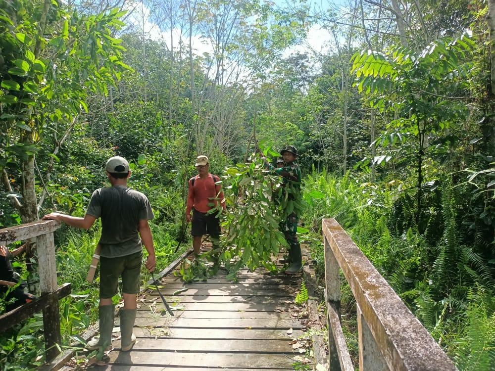 NANGA BAYAN – Anggota Satgas Pamtas RI-Malaysia Yonif 144/JY melaksanakan gotong royong bersihkan jalan desa bernama warga di desa Nanga Bayan Kecamatan Ketungau Hulu Kabupaten Sintang Kalbar.