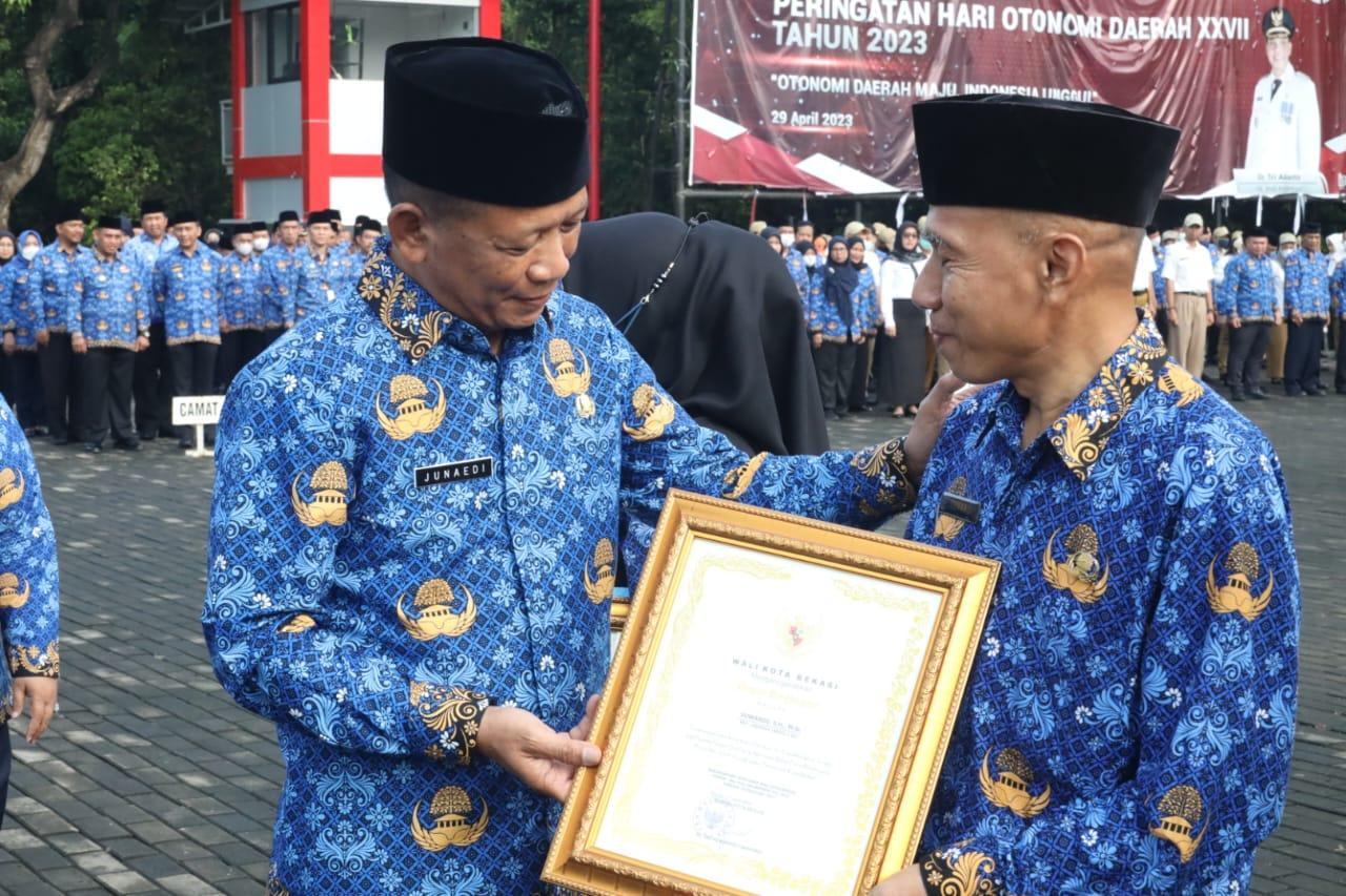 Rangkaian apel dengan penyerahan penghargaan purnabakti kepada para pegawai Pemerintah Kota Bekasi juga dihadiri oleh Perwakilan dari Taspen, diserahkan kepada ;