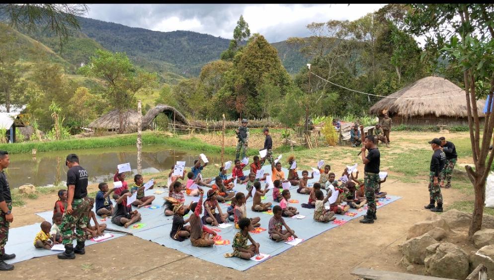 Keceriaan Anak-Anak Pegunungan Tengah Bersama Satgas Yonif Mekanis 203/AK Dalam Lomba Mewarnai