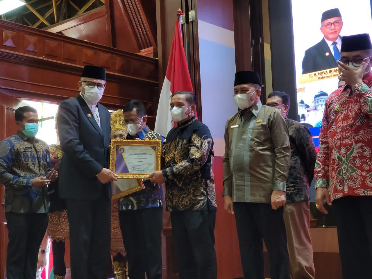 Penghargaan tersebut diserahkan langsung oleh Gubernur Aceh, Ir. H. Nova Iriansyah kepada sejumlah kepala daerah kab/kota yang meraih prestasi di ajang tersebut berlangsung di sela-sela pelaksanaan Musrenbang Provinsi Aceh di Anjong Mon Mata Banda Aceh, Kamis (14/4)