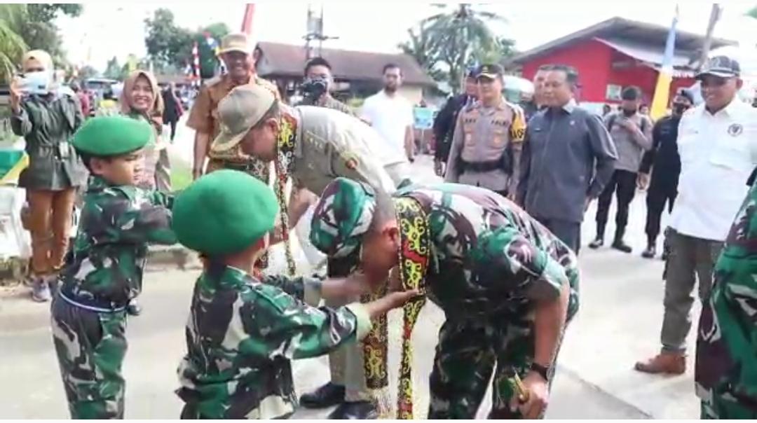 Danrem091/ ASN Brigjen TNI Dendi Suryadi didampingi Komandan Kodim 0901 Kolonel Armed Novi Herdian, Kapolresta Samarinda Komisaris Besar Polisi Ary Fadli, hadir dan di sambut pengalungan sal manik oleh dua anak berseragam TNI di iringi barisan ratusan anak pelajar Sekolah Dasar SDN 001 Jalan Kamboja dengan semangat penuh suka cita.
