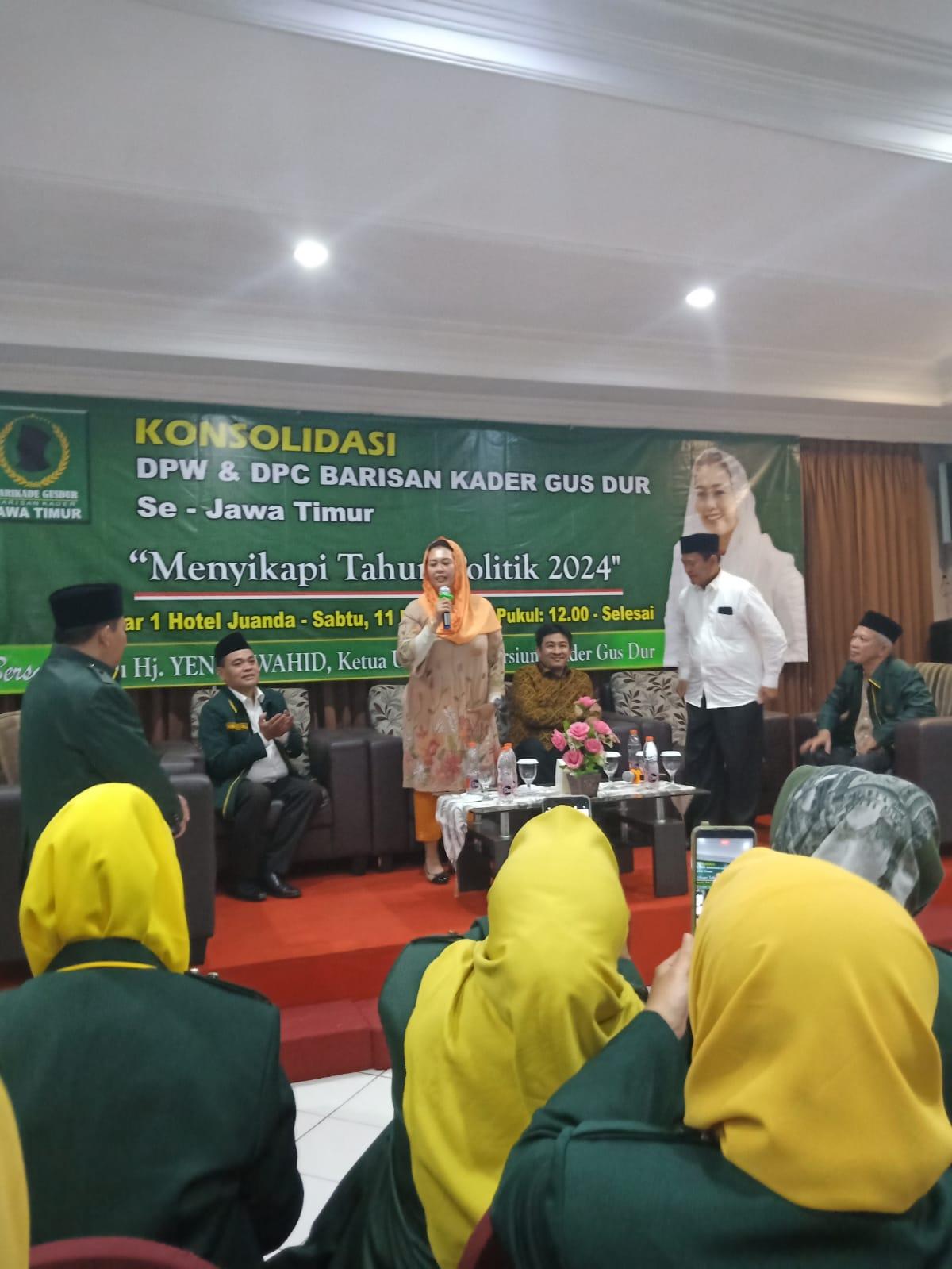 Konsolidasi hari ini Barisan Kader Gus Dur organisasi yang dipimpin oleh ibu Yeni Wahid yang membawa nama Marwah Kyai Haji Abdurrahman Wahid tentunya organisasi ini harus menunggu arahan dan petunjuk dari ibu ketua umum makanya dengan adanya konsolidasi dengan judul menyikapi tahun politik 2024.