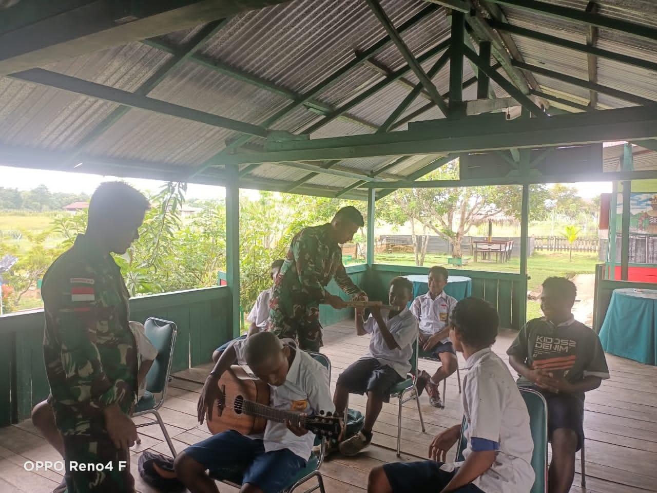 KEEROM – Personel Pos Kotis Satgas Pamtas RI-PNG Yonif 126/KC berikan kursus kilat kepada siswa SMP Negeri 1 Senggi tentang cara bermain gitar dan seruling sebagai sarana hiburan, bertempat di Pos Senggi Satgas Yonif 126/KC, Distrik Senggi, Kabupaten Keerom.