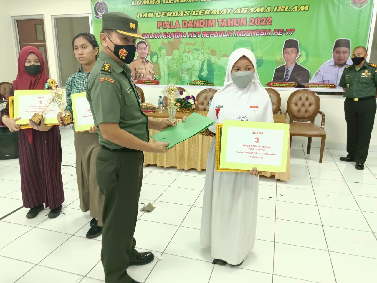 SAMARINDA – Acara penutupan lomba cerdas cermat bela negara dan cerdas cermat agama Islam pelajar Sekolah Menengah Pertama (SMP) dalam rangka menyambut HUT RI ke 77 memperebutkan Piala Dandim Tahun 2022, dilakasanakan hari ini oleh Kasdim 0901/Smd Letkol Inf BT. Napitupulu, S.H, yang mewakili Dandim 0901/Smd Letkol Arm Novi Herdian, S.H.,M.M, bertempat di SMP Negeri 1 Samarinda Jln. Kadrie Oening Kecamatan Samarinda Ulu Kota Samarinda, Rabu (27/7/22).