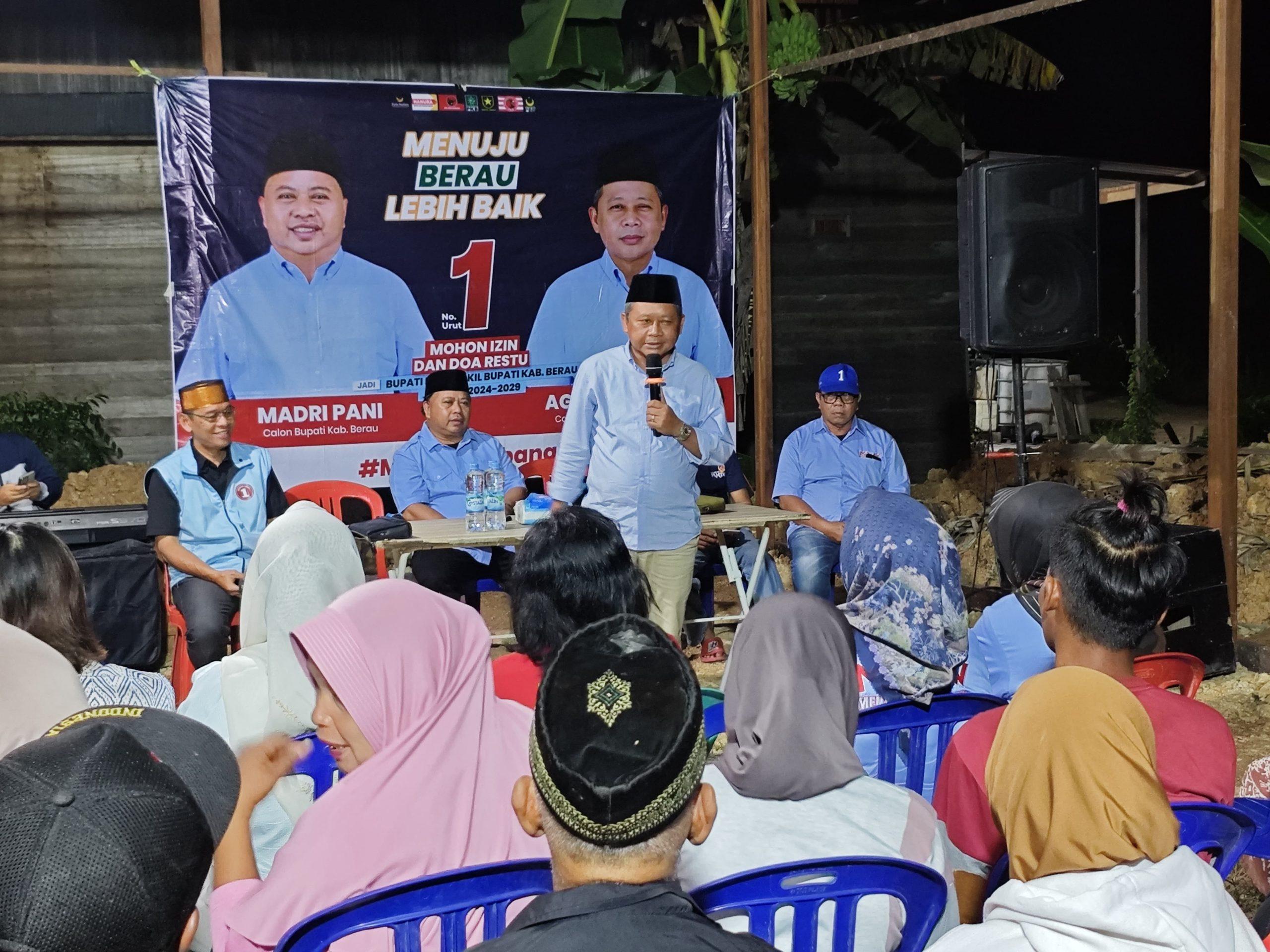 Madri Pani membuka acara dengan menyampaikan harapannya untuk masa depan Berau yang lebih baik. Ia menjelaskan bahwa pendidikan adalah salah satu prioritas utama mereka. Dalam programnya, mereka berkomitmen untuk menggratiskan biaya pendidikan bagi siswa di jenjang SD dan SMP, termasuk penyediaan buku paket dan seragam sekolah.