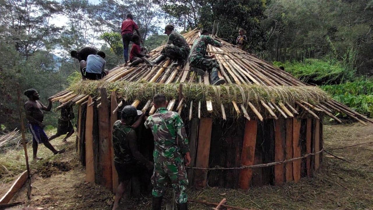 Mama Tabuni Terharu Satgas Yonif MR 412 Kostrad Bangunkan Kembali Honainya Pasca Terbakar