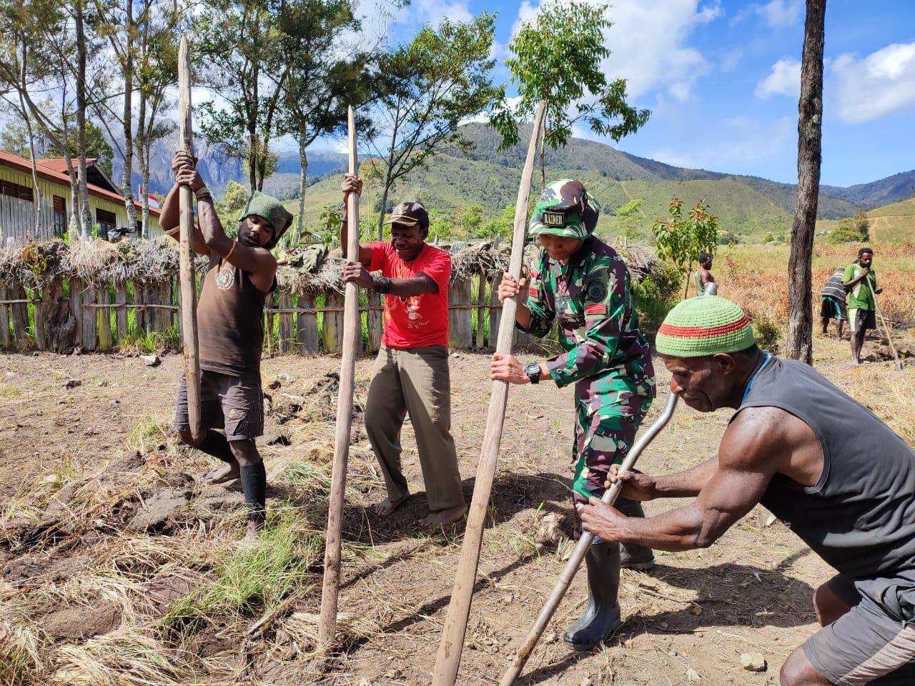 LANNY JAYA, PAPUA  – Prajurit Satgas Yonif MR 412 Kostrad dari Pos Malagayneri membantu warga masyarakat Loanom dengan ikut mengolah lahan perkebunan yang akan ditanami kentang dan ubi serta beberapa jenis sayuran lainnya yang berada di pegunungan tengah Desa Loanom Distrik Malagayneri Kabupaten Lanny Jaya Papua