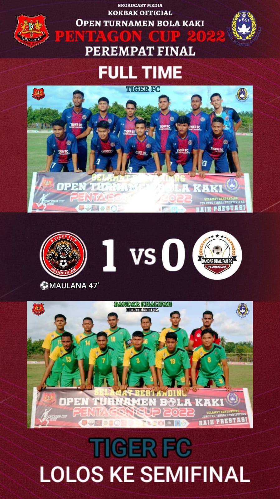 ACEH TIMUR – Kesebelasan Tiger FC Amat Lembeng Peureulak melaju ke Semifinal Pentagon Cup 2022 setelah menang tipis 1-0.