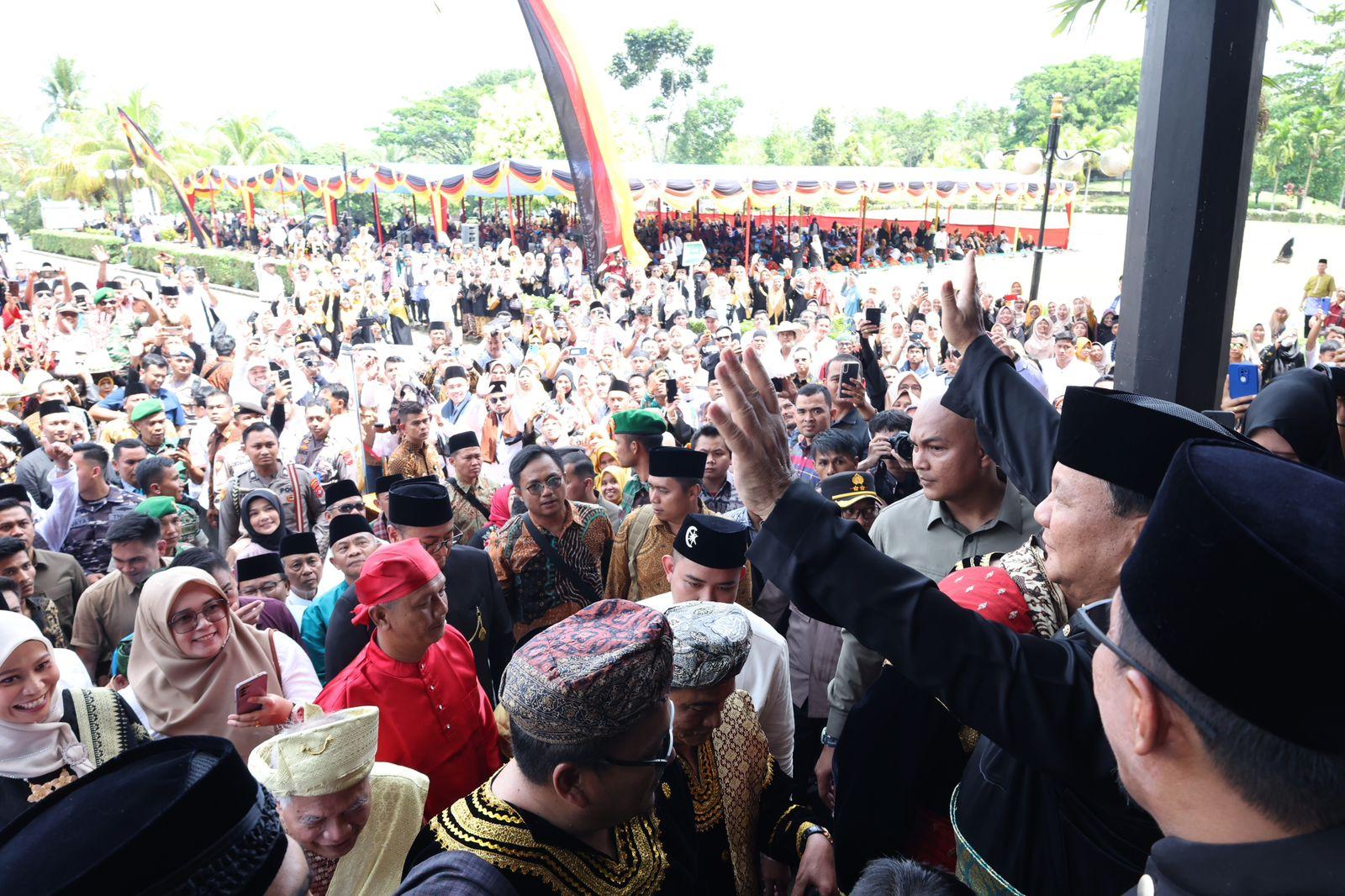 Sesampainya di sana, Menhan Prabowo disambut oleh Dipertuan Raja Alam Pagarium Sultan Muhammad Farid Thaib Tuanku Abdul Fatah dan tarian Galombang dan Prosesi Adat Batagoa ( siraman butiran beras ). Acara kemudian dilanjutkan dengan Prosesi Adat berupa penyerahan tongkat dan sahut-sahutan pantun oleh Ninik Mamak.