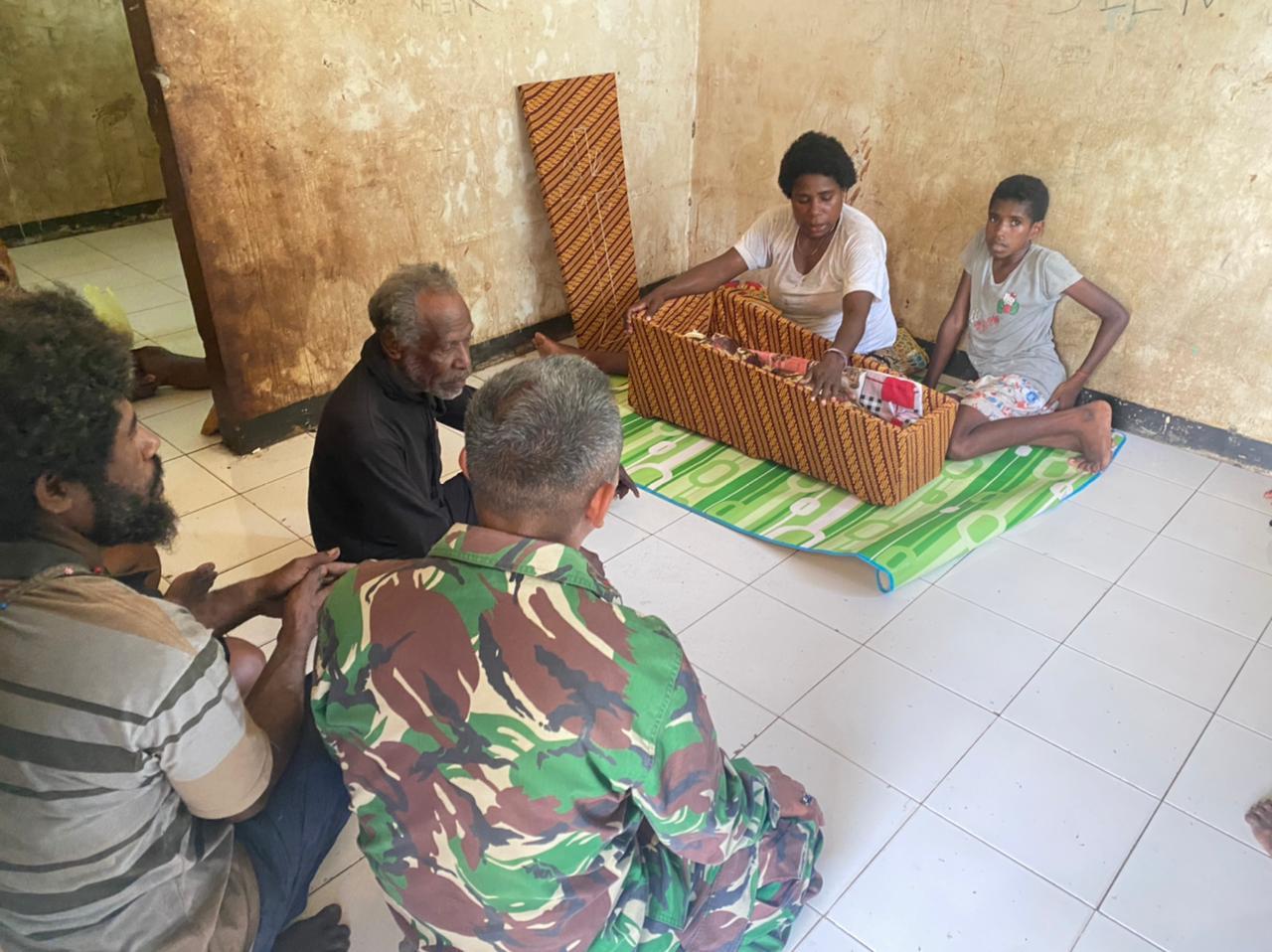 Menerima Bantuan dan perhatian dari TNI, Bapak Markus Serife selaku orang tua Almarhum mengucapkan banyak Terima kasih kepada pos Satgas yang menghibur dan memberikan semangat serta Sembako.