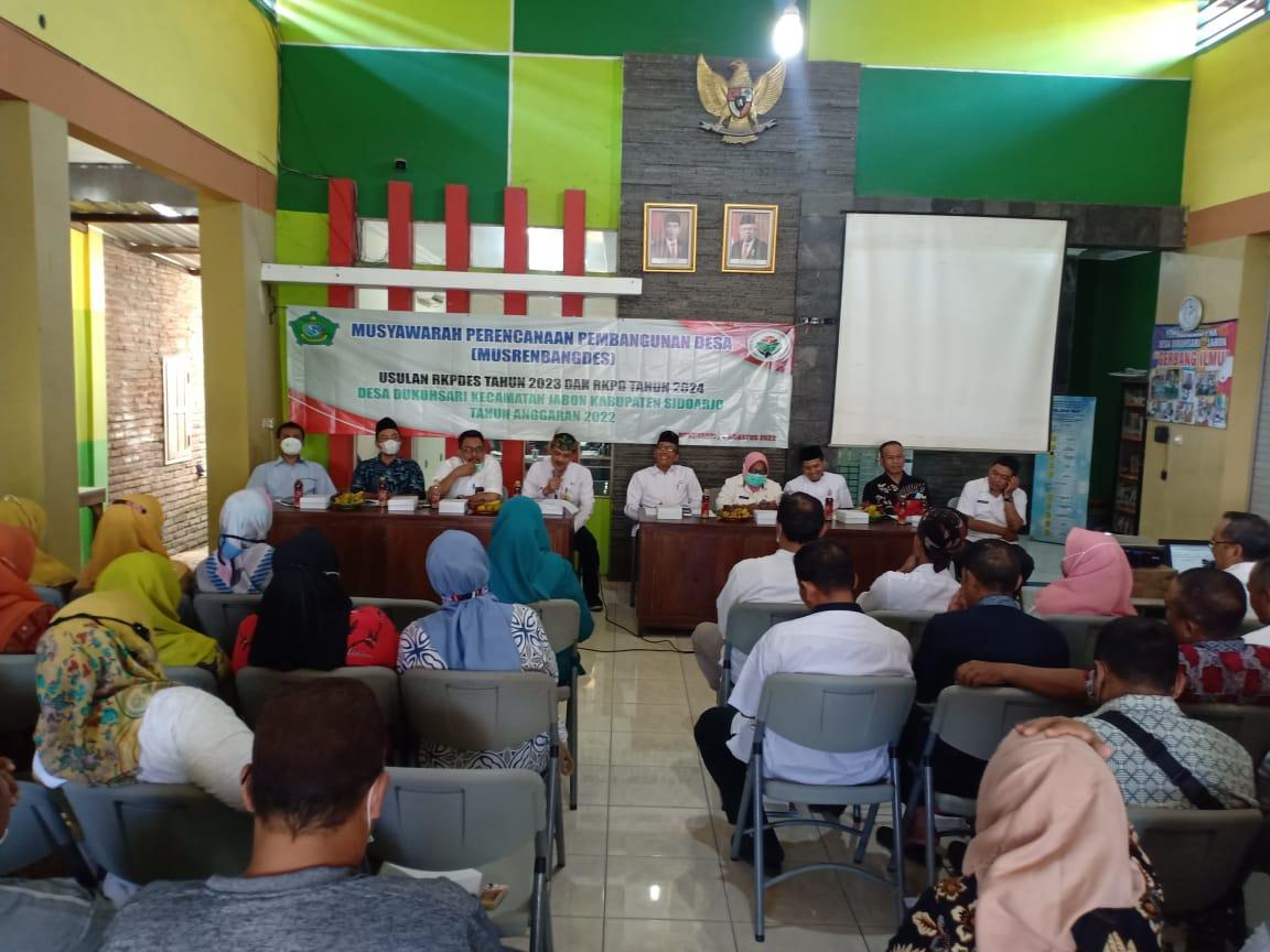SIDOARJO – Untuk menampung usulan warga masyarakat terkait pembangunan di tingkat desa dan tepat sasaran, pada hari Rabu (3/08/2022) diadakan Musrembangdes di balai desa Dukuhsari Kecamatan Jabon Kabupaten Sidoarjo untuk tahun 2023 yang dihadiri oleh Camat, Sekretaris Camat, perangkat desa, pengurus RT/RW, tokoh masyarakat, BPD dan lainnya.