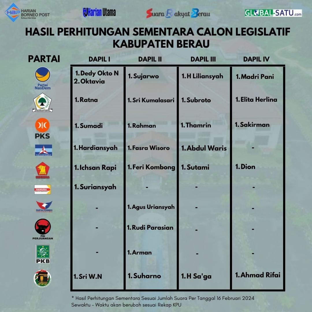 Banyak nama baru yang mungkin akan memasuki kantor DPRD Kabupaten Berau pada tahun 2024 ini, Meskipun hasil perhitungan ini masih bersifat sementara, sehingg sewaktu-waktu dapat berubah sesuai dengan rekapitulasi resmi yang akan dilakukan oleh KPU Kabupaten Berau.
