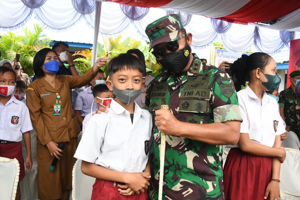 TJ MORAWA – Pangdam I/BB, Mayjen TNI Hassanudin, SIP, MM, mengapresiasi pelaksanaan vaksinasi anak usia 6-11 tahun di SDN 104238 Telagasari, Kecamatan Tanjung Morawa, Kabupaten Deliserdang, Selasa (8/2/2022).
