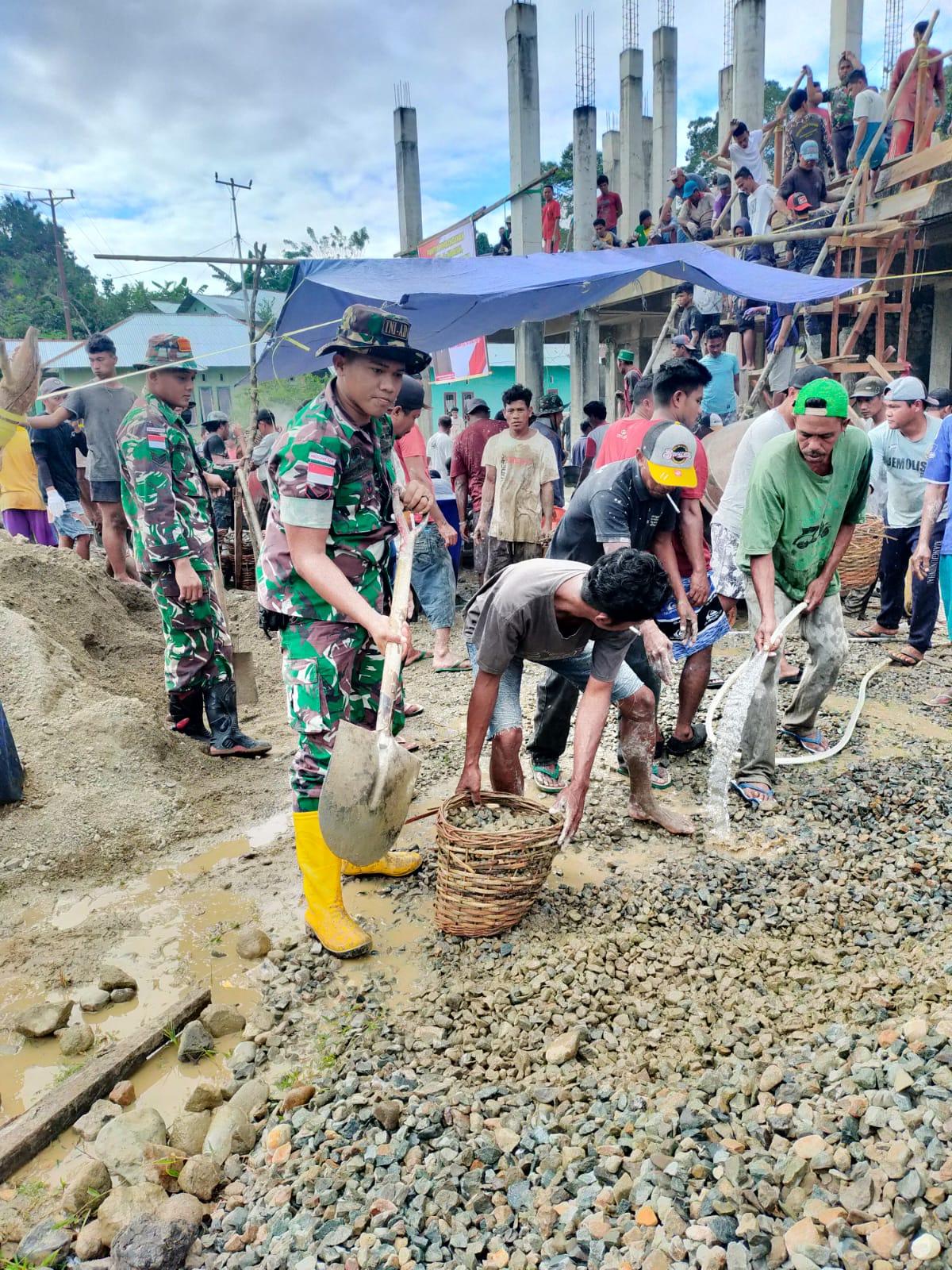 Adapun kegiatan renovasi yang dilakukan berupa pengecoran tiang penyangga dan atap Masjid, sebagian personel juga melaksanakan plesterisasi bagian luar Masjid.