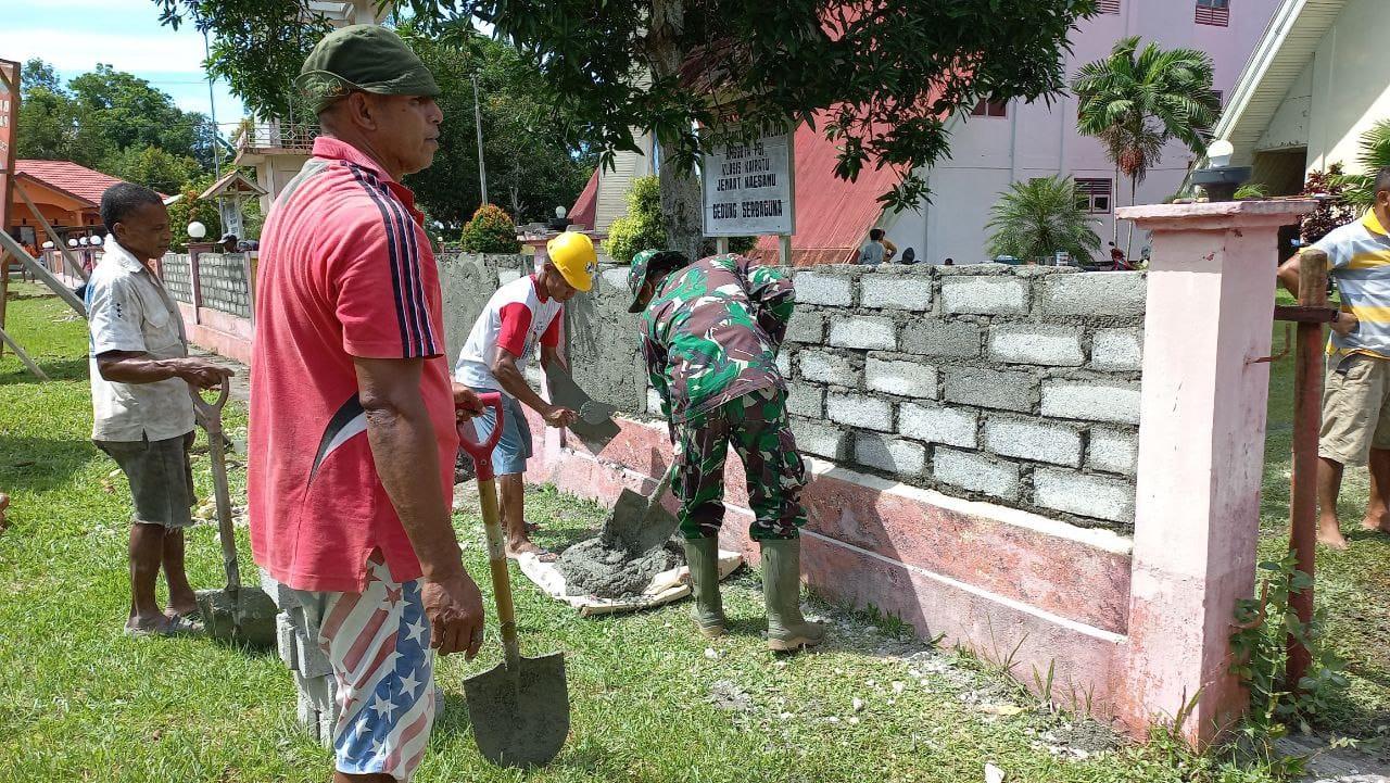 SERAM BAGIAN BARAT –Β Anggota Pos Ramil Waesamu Satgas Kodim Maluku Batalyon Arhanud 11/WBY yang dipimpin oleh Danpos Sertu Wijayanto bersama dengan masyarakat bergotong royong membangun Gereja Zebaut di Desa Waesamu, Kecamatan Kairatu Barat, Kabupaten Seram Bagian Barat, Senin (7/3/2022).