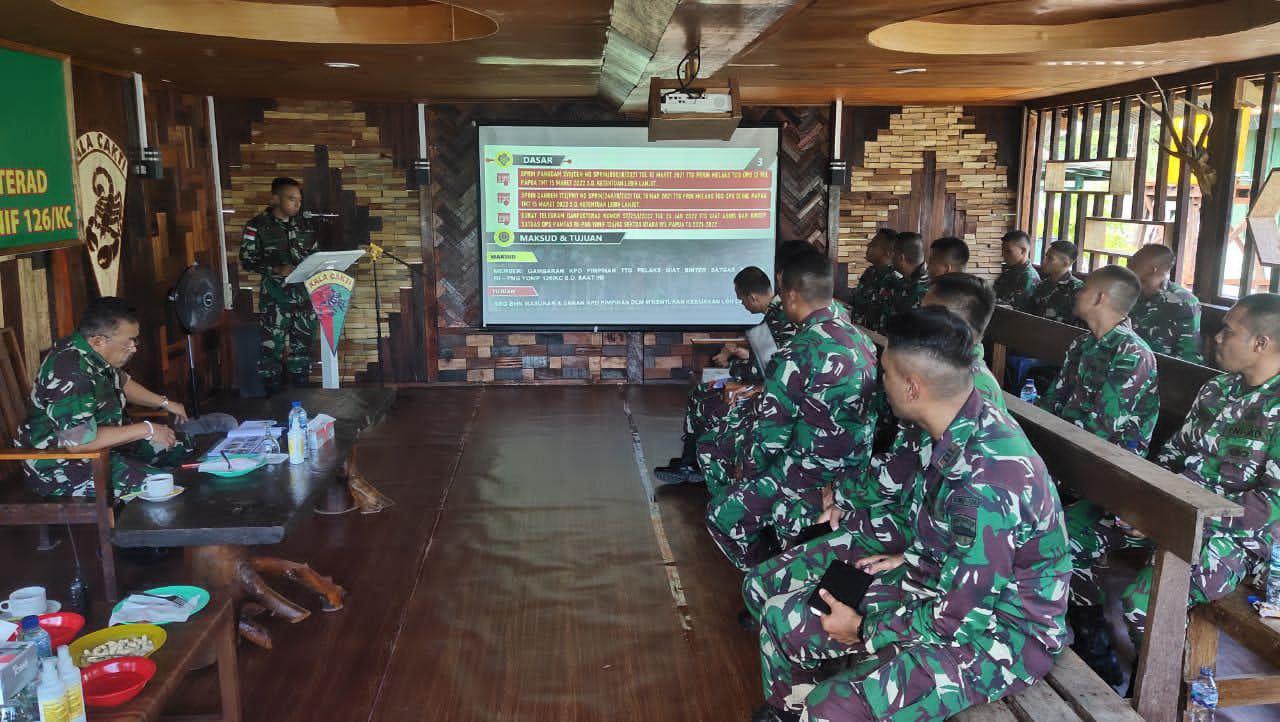 Kolonel Inf Siswanto, Kasubditbindiklatter Sdirbindiklat Pusterad selaku Ketua Tim menerima laporan dan paparan kegiatan teritorial yang telah dilaksanakan oleh Satgas Yonif 126/KC selama ± 3 bulan di perbatasan RI-PNG.