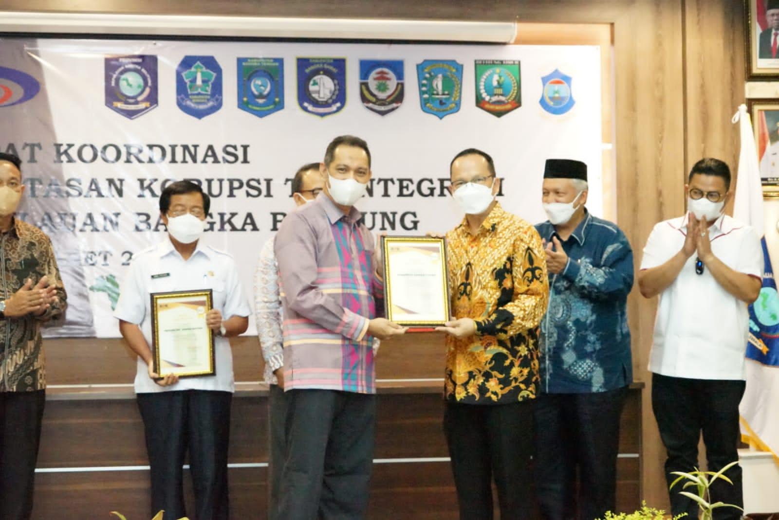 Penyerahan penghargaan ini digelar saat Rapat Koordinasi Pemberantasan Korupsi Terintegrasi dengan pemda se-Provinsi Babel di Ruang Pasir Padi Lantai 3 Kantor Gubernur Babel, Selasa (8/3/2022).