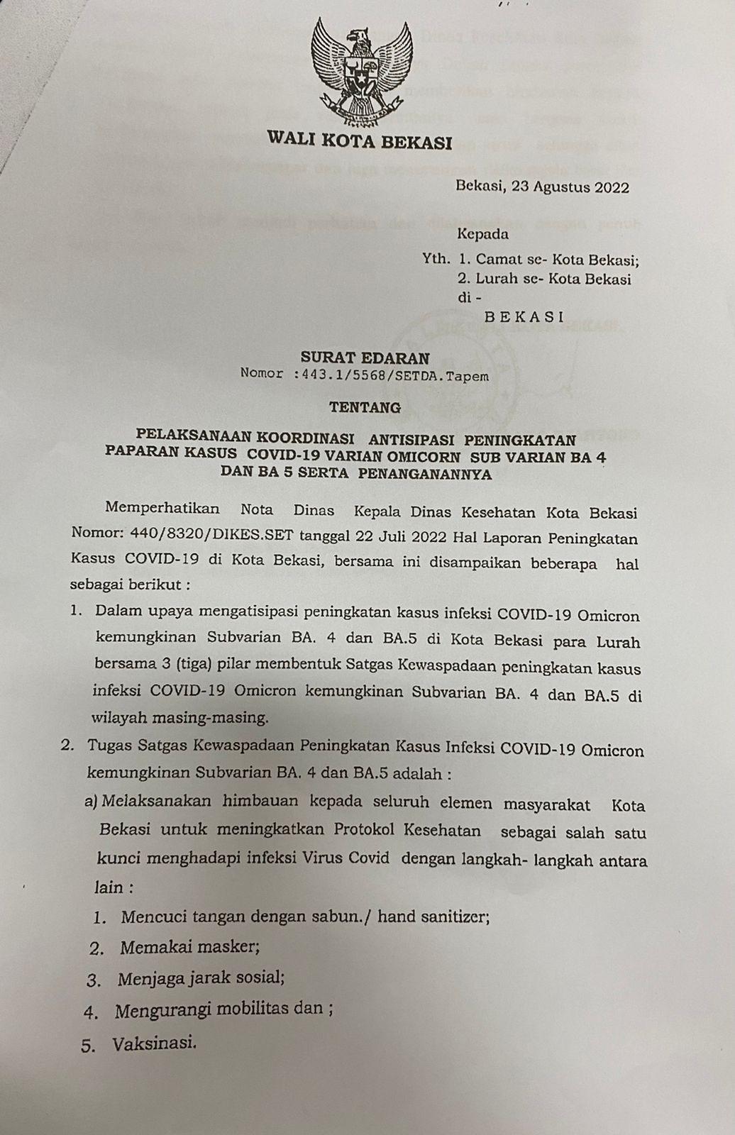 Pemkot Bekasi Keluarkan Edaran Antisipasi Peningkatan Paparan Kasus Covid-19 Sub Varian Omicron Sub Harian BA 4 Dan BA 5 Serta Penanganannya