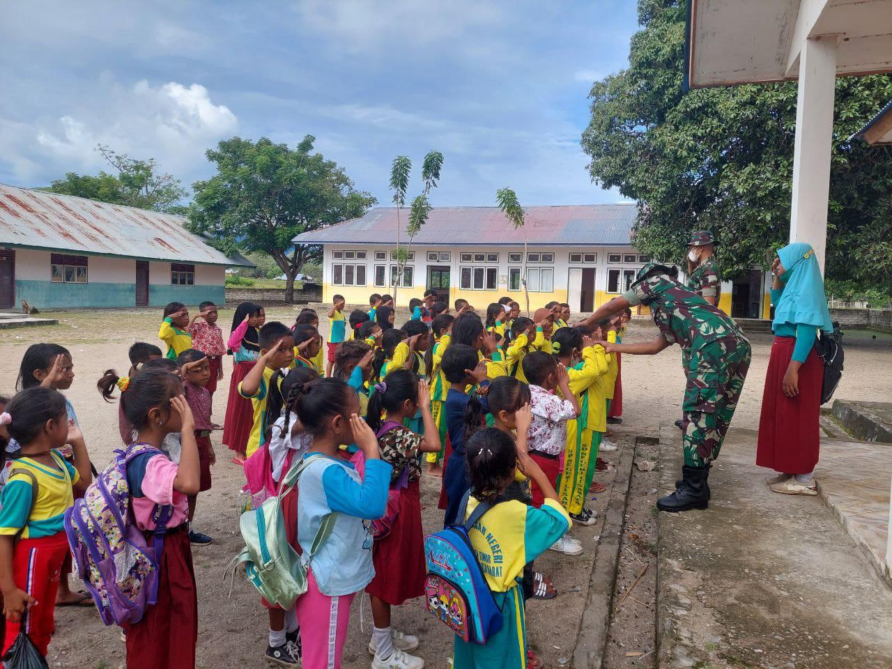 MALUKU TENGAH – Anggota Pos Ramil Lisabata yang tergabung dalam Satgas Kodim Maluku Yonarhanud 11/WBY, memberikan Pembinaan Ketahanan Wilayah (Bintahwil) dan Wawasan Kebangsaan (Wasbang) kepada siswa-siswi SD Negeri 16 di Lisabata Timur Kec. Seram Utara Kab. Maluku Tengah, Senin (14/2/2022).
