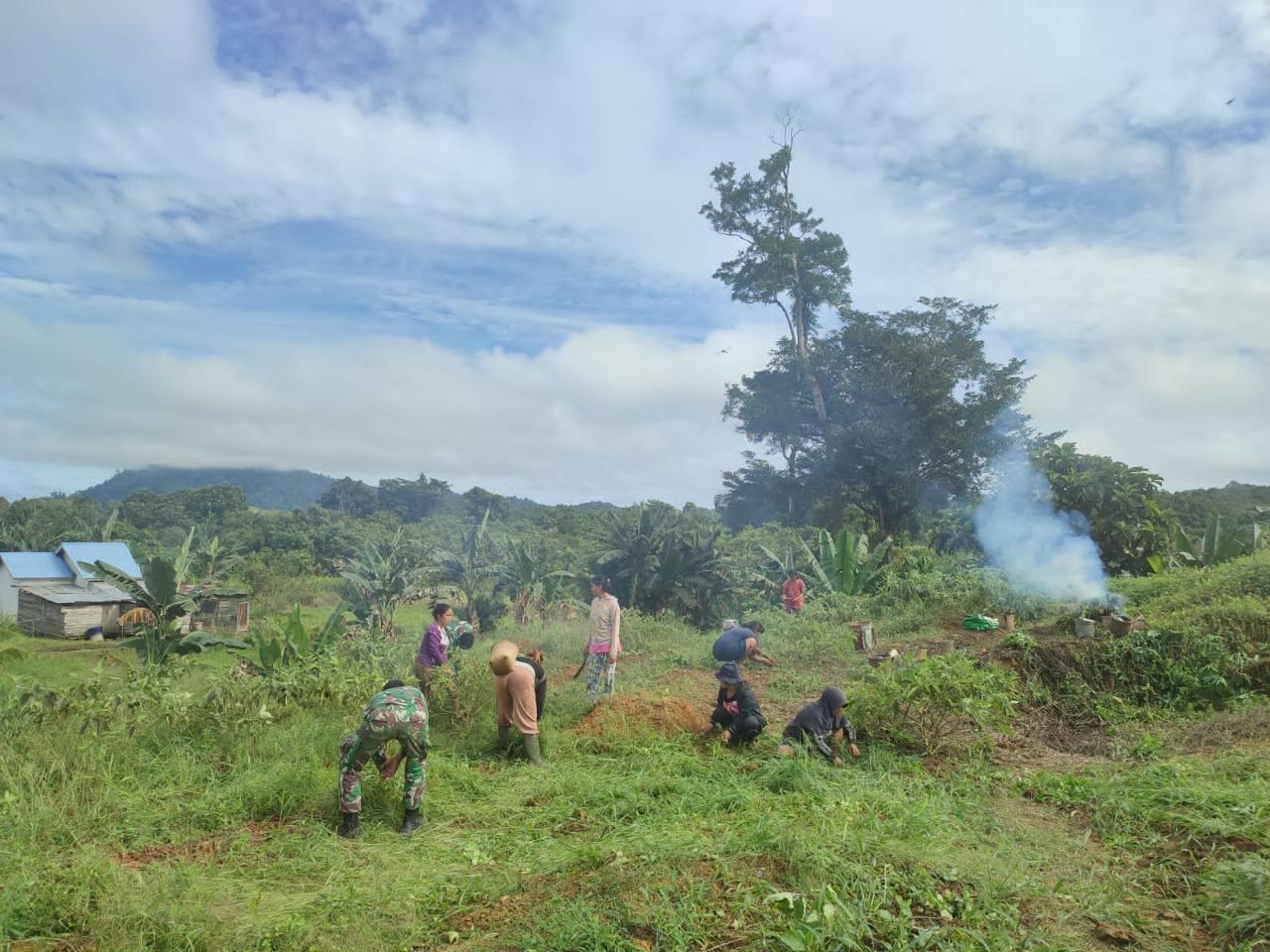 Personel Satgas Pamtas Yonarmed 19/105 Trk Bogani Bantu Kelompok Wanita Tani Buka Lahan Pertanian