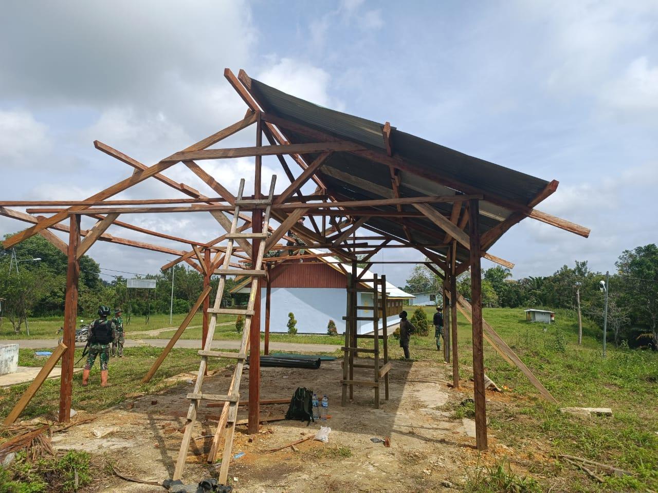 Personel Satgas Yonif 126/KC Bangun Sarana Nonton Bersama Untuk Masyarakat Perbatasan