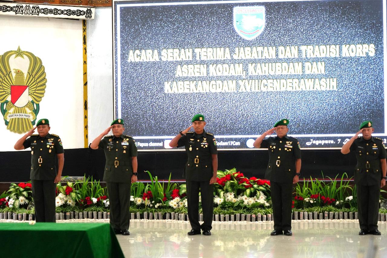 “Pejabat Kodam yang diserahterimakan jabatannya yaitu Asren Kodam XVII/Cenderawasih dari Kolonel Inf Saut Edward Tampubolon kepada Kolonel Arm Edwin Habel, S.A.P., M.M. dan Kahubdam XVII/Cenderawasih dari Kolonel Chb Wiriadi, S.E. kepada Letkol Chb Anton Prasetia, S.Sos, serta penyerahan Jabatan Kabekangdam XVII/Cenderawasih dari Pangdam XVII/Cenderawasih kepada Letkol Cba M. Aminuddin Aziz, M.Si. (Han),” kata Kapendam.
