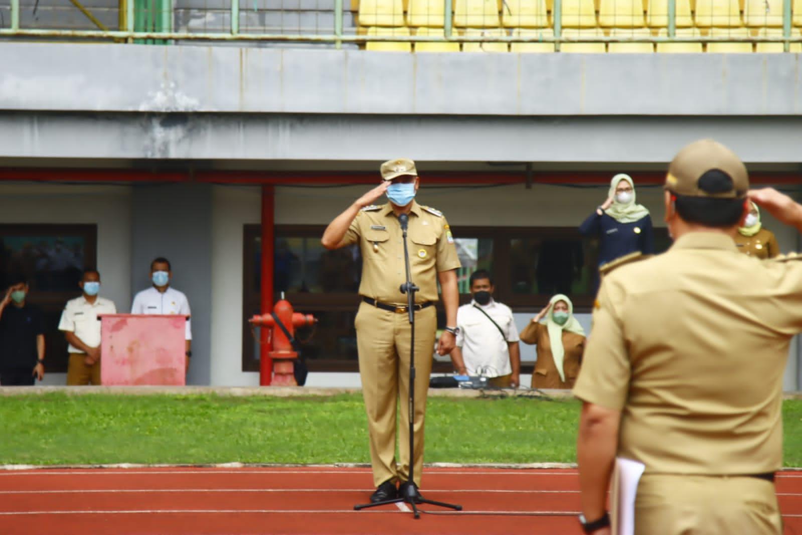 KOTA BEKASI – Tri Adhianto memimpin apel perdana sebagai Pelaksana Tugas (Plt) Wali Kota Bekasi di Stadion Patriot Chandrabaga, Senin (10/1/2022).