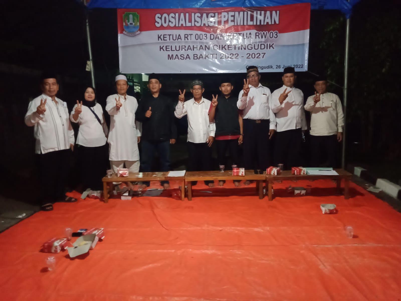 Panita pemilihan Ketua RT 003 membuka pendaftan calon bakal Ketua RT sampai waktu yang ditentukan tidak ada warga yang mendaftarkan dirinya ke panitia untuk menjadi bakal calon ketua RT 003 , Samin Surnya yang mendaftakan dirinya ke panitia pemilihan Ketua RT 03 dan terpilih kembali menjadi Ketua RT 003 RW 003 Kelurahan Ciketing Udik periode 2022 – 2027.