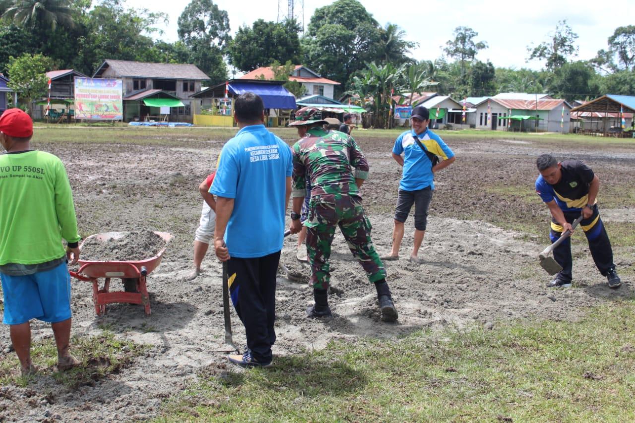 Satgas Pamtas Yonif 645/GTY Bersama Masyarakat Perbatasan Kerja Bakti Pembenahan Lapangan Sepakbola